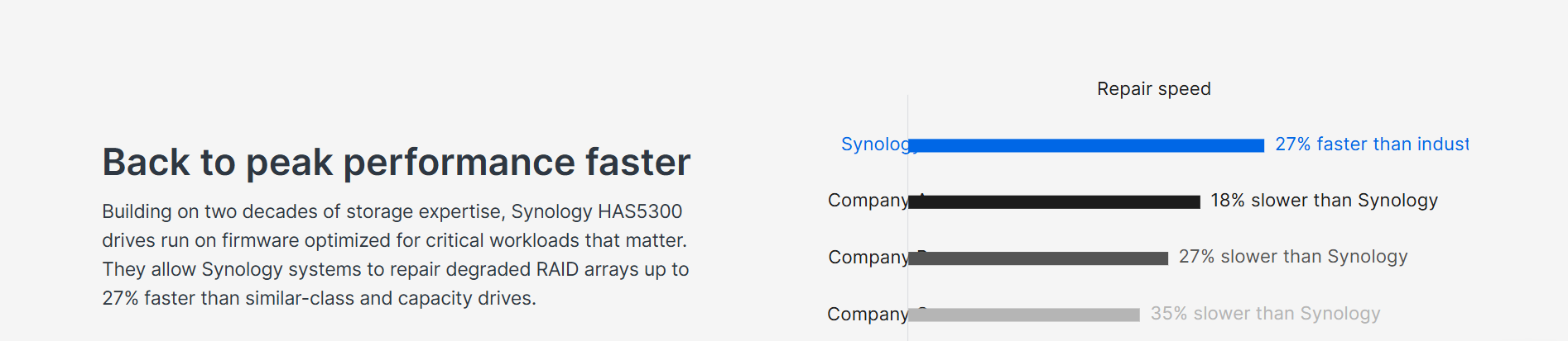 The HAS5300 series drives leverage the low-latency SAS protocol. When paired with high-performance and highly scalable Synology HD, SA, or UC series solutions, they ensure that mission-critical workloads always have access to dependable and fast storage.