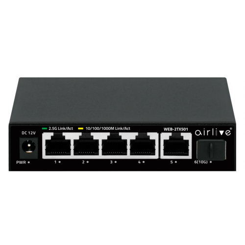 The AirLive Multi-Giga switch, WEB-2TX501 is a Web Managed switch, which supports 5 RJ45 and 1 SFP+ ports for delivering up to 2.5Gbps extra high-speed connection on RJ-45 and 10G SFP+ on fiber optic. Supports WEB Management function and is easy to manage and maintain. The easy to operate WEB-2TX501 has several functions like VLAN setting for a more secure connection. QoS to have more control of the bandwidth and many more like, IGMP, Loop Prevention, Port-Base Mirroring, Port Isolation, Bandwidth Control, Security (MAC Address /table / search / static MAC; Storm control and more. With the 2.5G multi-Giga switch, you can connect to a variety of 2.5GbE-enabled devices, such as NAS | NVR | PC | Server | Laptop, for enjoying faster experience and handle bandwidth-hungry applications. Designed in a slim sized solid housing, it’s an affordable, space-saving solution suitable to Home and SMB network applications.